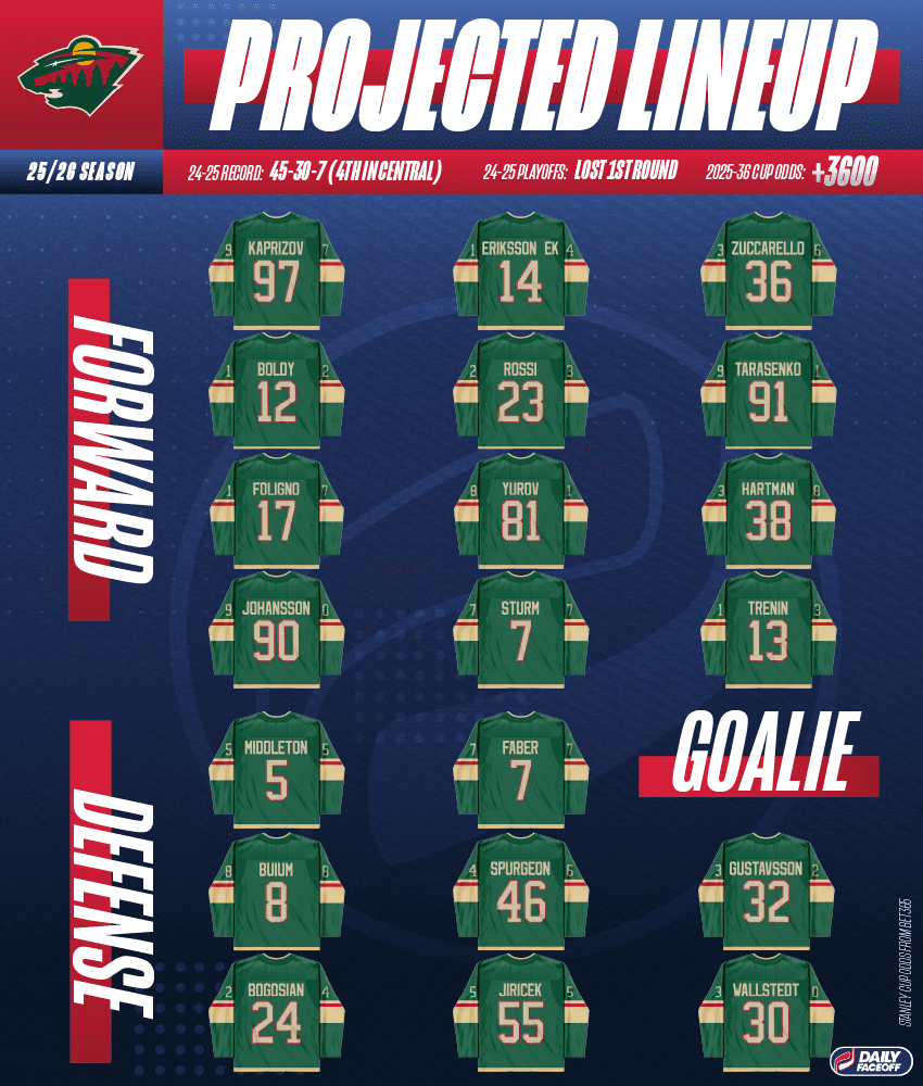 The early frontrunner for the last top-six spot is Red Wings castaway Vladimir Tarasenko. Even if the big Russian’s 80-point prime is gone for good after a career-worst season (11 G in 80 GP), the Wild hope he can recapture his top-six production (23.2 G, 59.4 P per 82 GP) from 2022-24. Ryan Hartman is also an option after a big postseason (2 G, 6 P), but flip-flops between dangerous power forward (26.7 G per 82 GP from 2021-2024) and fourth-line problem child (five suspensions) with frustrating frequency.