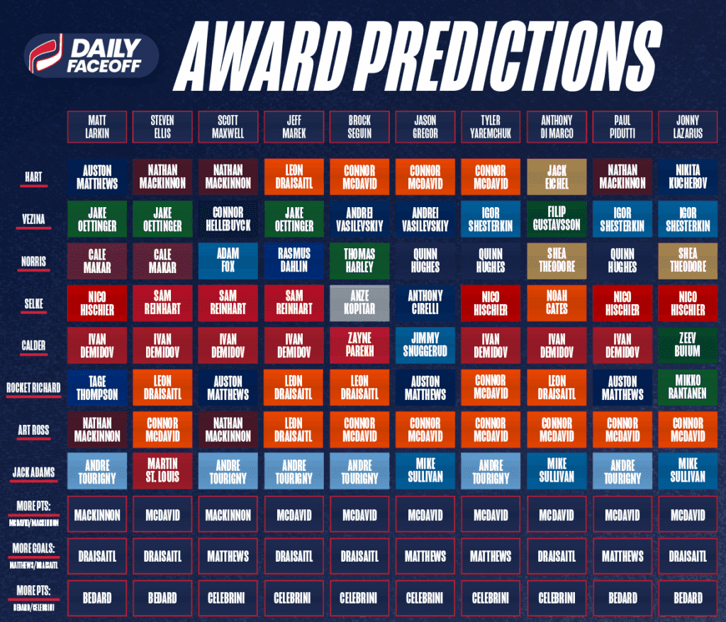 – While the vote is pretty split on the Hart, a large contingent has McDavid leading the league in scoring and Leon Draisaitl winning the goals race. They only played 67 and 71 games, respectively, last season. That didn’t stop Draisaitl from taking the Rocket Richard, but it will be interesting to see if the Edmonton Oilers punt the individual award chases in favor of load-managing their superstars, who, don’t forget, will also be competing at the 2026 Olympics.