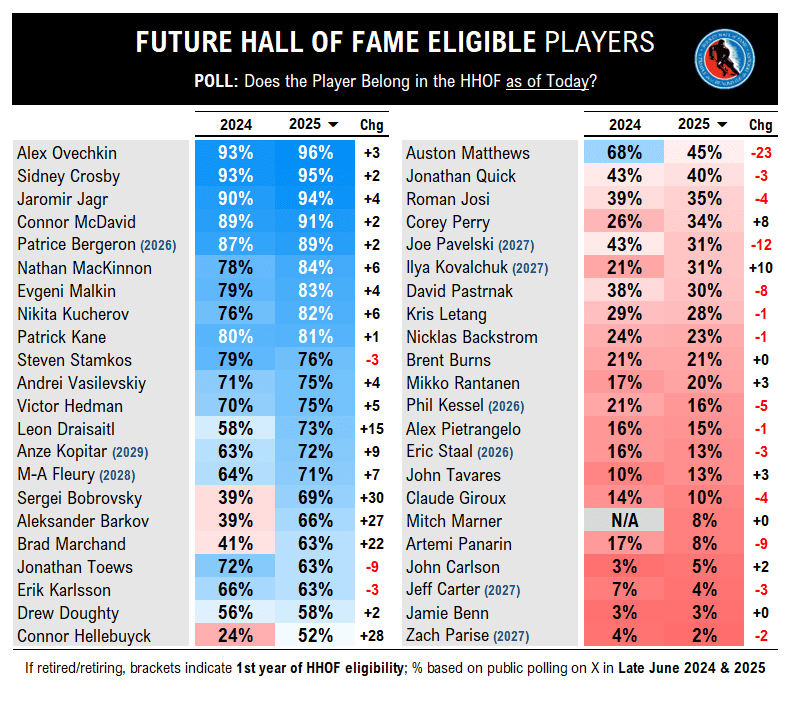 Why 2025-26 is Important: In January, I waxed poetic on J.T.’s strong Hall of Fame case. He’s since finished a 38-goal season and signed a four-year extension. But there’s this: Tavares polled at 13% in June. That’s an eye-opening level of Hall of Fame disapproval for a player nearing 500 goals, especially one who played his 20s in low-scoring times. But it tells us that Tavares’ Hall of Fame spot is far from secure. Will he need 600 goals or a credible postseason résumé to silence any doubts? Will he have to wait a long time like comparable forwards Jeremy Roenick, Pierre Turgeon, and Daniel Alfredsson? At 35, popping out a few more 30-goal years and playing a prominent role beyond the second round (yes, it exists, Leafs fans) could be the cherry on top of the low-fat, no-sprinkles vanilla sundae that is Tavares’ exceptional career.