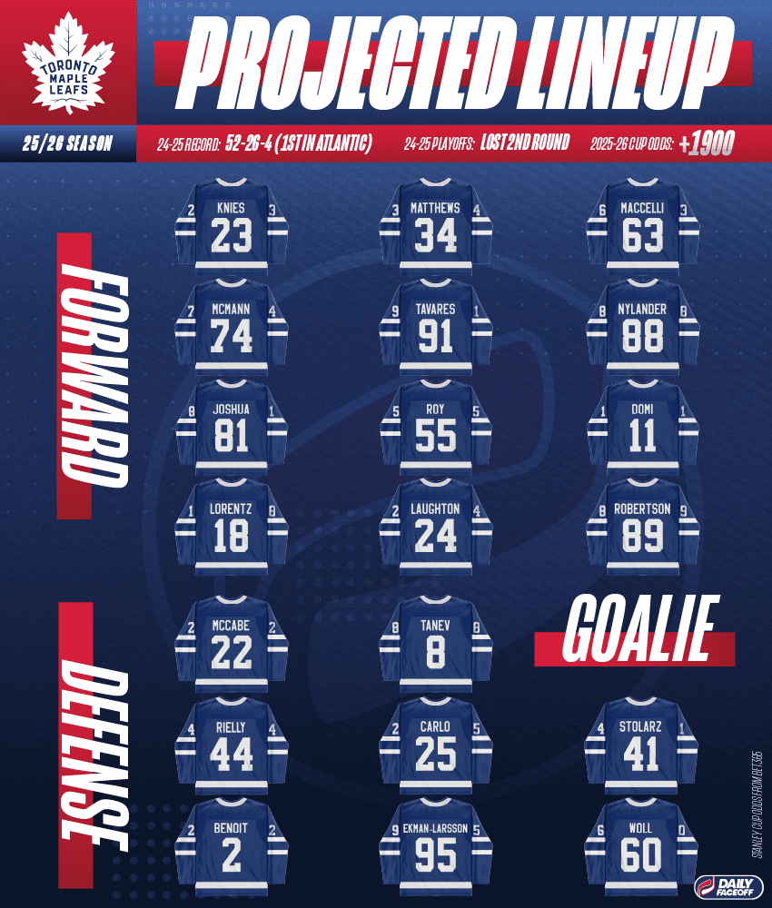 William Nylander and John Tavares will be relied upon as much as ever to generate offense from the second line. Nylander is one of the NHL’s most consistent forwards, posting 80 or more points in four consecutive seasons and 40 or more goals in three consecutive seasons, missing one total game in the past four years. Nylander can be counted on to remain elite in his age-29 season, but what will Tavares do at 35? His 38 goals last season were his second most in a Leaf uniform, and he was a dominant net-front scorer after the 4 Nations break in particular, but he’s at an age where decline can strike at any point. Bobby McMann is the most likely option to play with Tavares and Nylander, having done so in spurts last year, using his size and speed to bag 20 goals.
