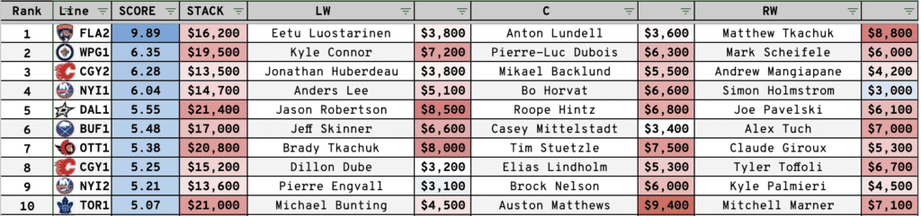 | Dube – Lindholm – Toffoli Huberdeau – Backlund – Mangiapane Ritchie – Kadri – Coleman Lucic – Lewis – Duehr ——————————————————— Weegar – Andersson Hanifin – Tanev Zadorov – Stecher | Sanford – Glass – Tomasino Sherwood – Novak – Evangelista Trenin – Sissons – Asplund Afanasyev – Jankowski – McCarron ——————————————————— McDonagh – Fabbro Barrie – Livingstone Stastney – Foote |