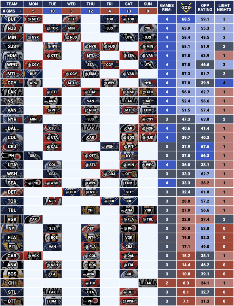 If you’re looking for a full breakdown of every team’s upcoming schedule, check out our Fantasy Hockey Strength of Schedule Tool — updated daily to show which teams have the most games and valuable light-night matchups each week.