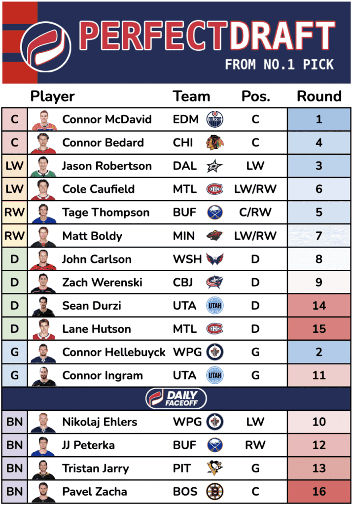 (1) Round 1, Pick 1: Connor McDavid (EDM – C) – ADP: 1.1