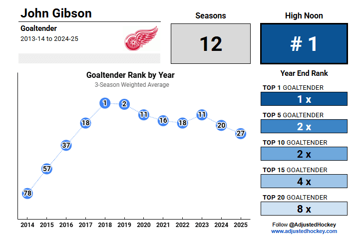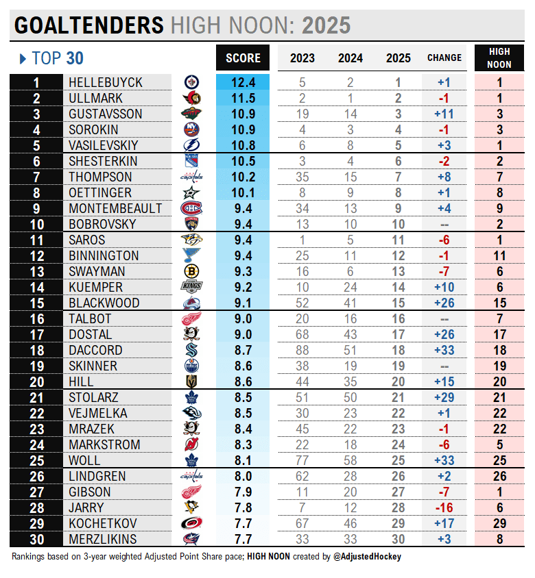 This is the third and final instalment of the 2025 High Noon series: the top 30 goaltenders. The approach uses a three-year weighted average of adjusted point shares to systematically rank the league’s best by position — hockey’s answer to the individual world player rankings in golf and tennis.