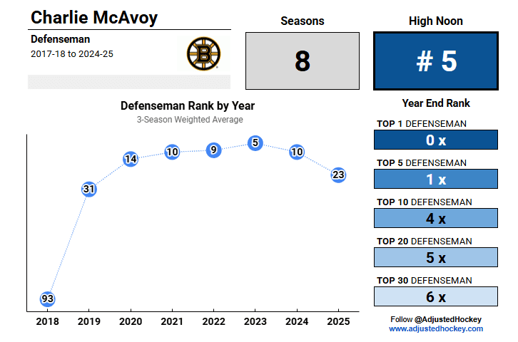 Before we begin, here’s a reminder on the methodology. Originally a Hall of Fame tool, you can read about High Noon’s mechanics in this original post. It uses a weighted three-year average: 2024-25 counts 50% of a player’s score; 2023-24 gets one-third (33%); 2022-23 is one-sixth (17%). The split allows a long-range view of performance. One great season won’t rank a player among the game’s elite.