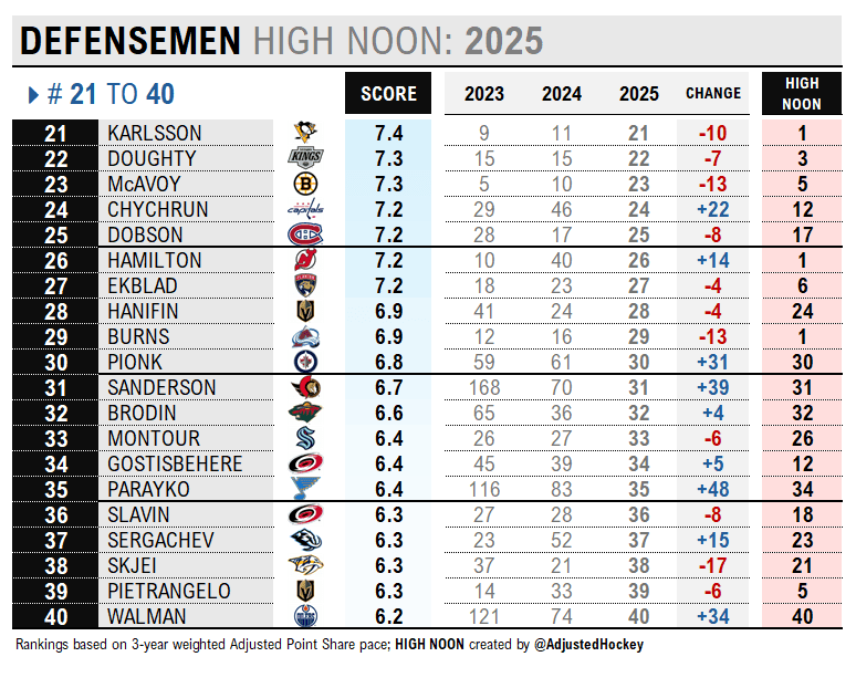 If you’re new to the High Noon series, check out last week’s kickoff, which ranked the NHL’s top 50 forwards. The method uses a three-year weighted average of adjusted point shares to systematically rank the league’s players by position – hockey’s answer to the individual global hierarchies of golf and tennis.