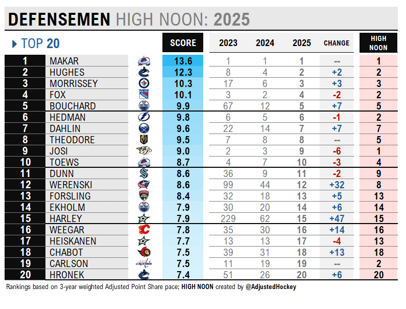 How to Read the Rankings: Roman Josi’s score in the High Noon system below is 8.7, ranking him the NHL’s #9 defenseman in 2025. The Change column (-6) shows his drop from #3 to #9 since last summer. Josi’s career peak — his High Noon — is #1, the highest he’s been ranked previously (2020).