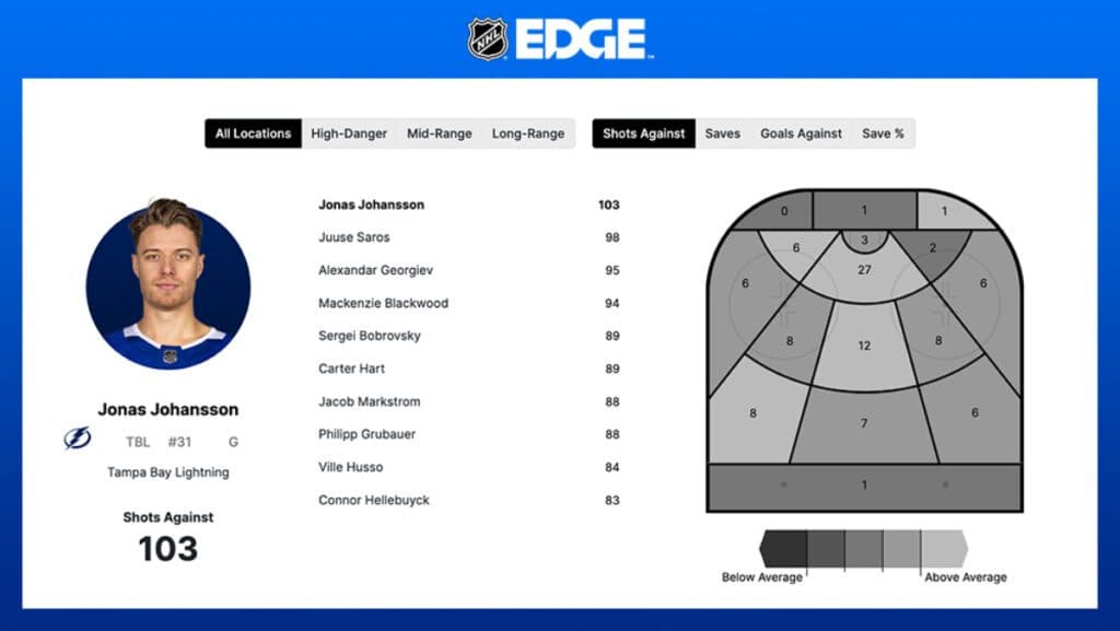 The comparison tool is especially powerful when it comes to goaltenders. If you’re a fan of the Boston Bruins, you could dial up Jeremy Swayman’s start to this season compared to last year and see that his save percentage on shots from mid-range is actually up year-over-year. For each individual goalie, you can see a map of the ice detailing where each shot originated from.