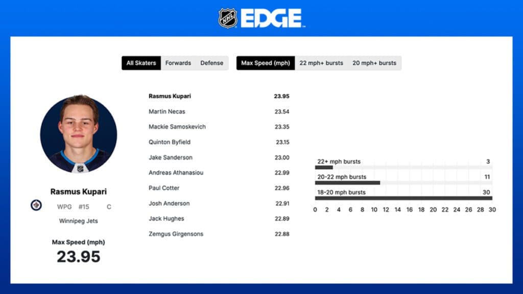 Until today, for the first time, when you’re able to look up and see that Winnipeg Jets forward Rasmus Kupari surprisingly holds that mark through the opening two weeks of the season, hitting a league-best peak speed of 23.95 mph on Oct. 17 against the Los Angeles Kings with 13:44 remaining in the second period.