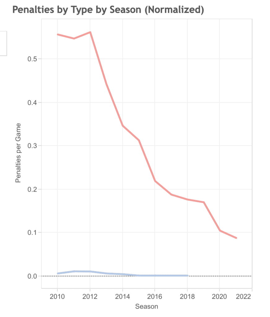 The data trend shows that players are cleaning up their acts in a major way. Boarding calls have plummeted significantly. We’ve only seen three boarding majors handed out this season and zero checking-from-behind penalties according to the data for 2022-23.